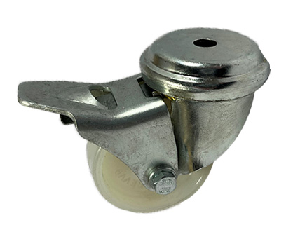 50mm White Nylon Wheel fitted into a Single Bolt Hole Swivel Castor (Revvo Brand) with wheel brake to suit an M8 Fixing bolt. The load capacity of this castor is 50kg using manual propulsion at 4km/h.