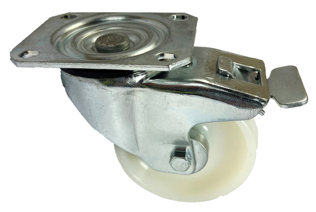 100mm Swivel Castor with total stop brake with a White Nylon Wheel. The top plate measure 102mm x 84mm and has 80x60mm bolt hole centres. The castor’s overall height is 128mm and the wheel has a tread width of 35mm, a smooth plain bore and the load capacity of this castor is 250kg using manual propulsion at 4km/h